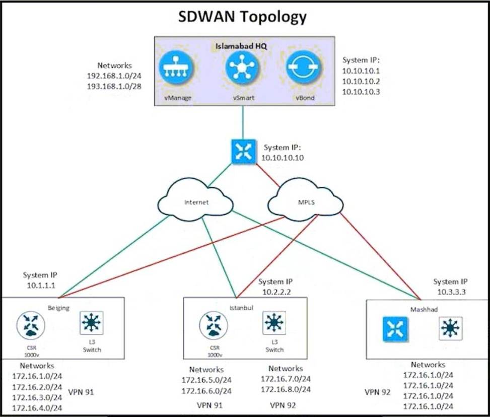The Cisco SD-WAN network is configured with a default full-mesh topology. Islamabad HQ and Islamabad WAN Edges must be used as the hub sites. Hub sites MPLS TLOC must be preferred when forwarding FTP traffic based on a configured SLA class list.