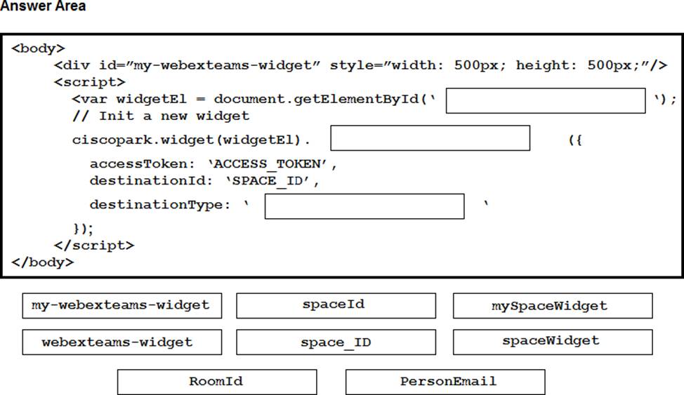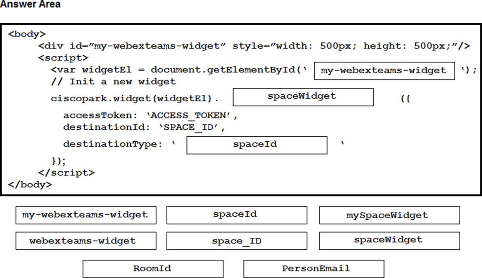 Drag and drop the code to add a Webex Teams Space Widget in an existing HTML page. Not all items are used.