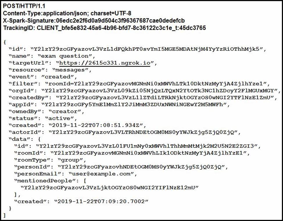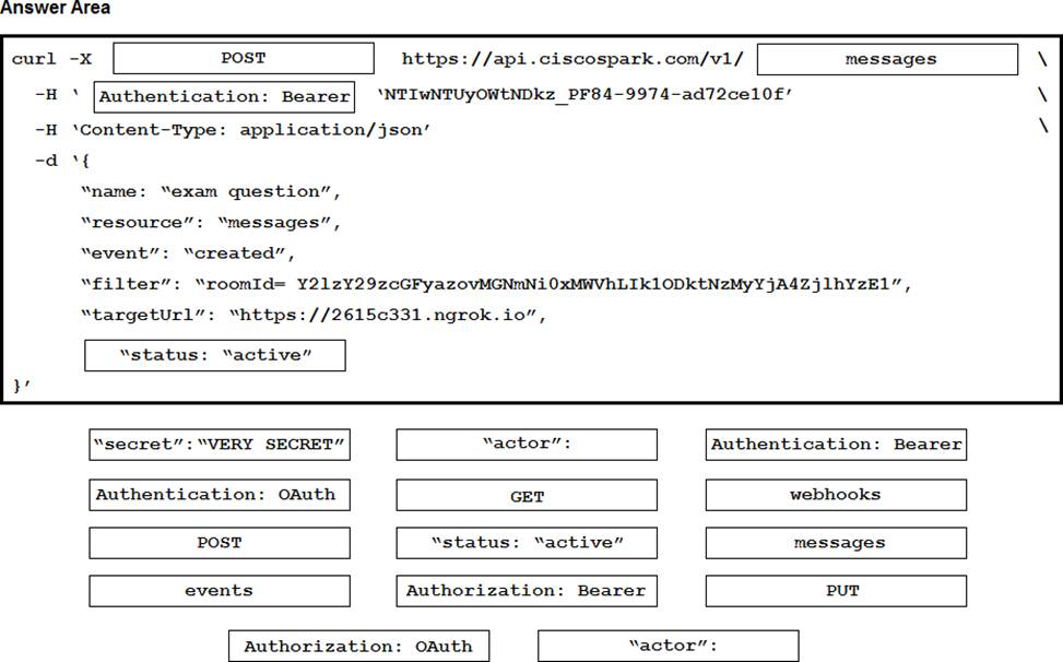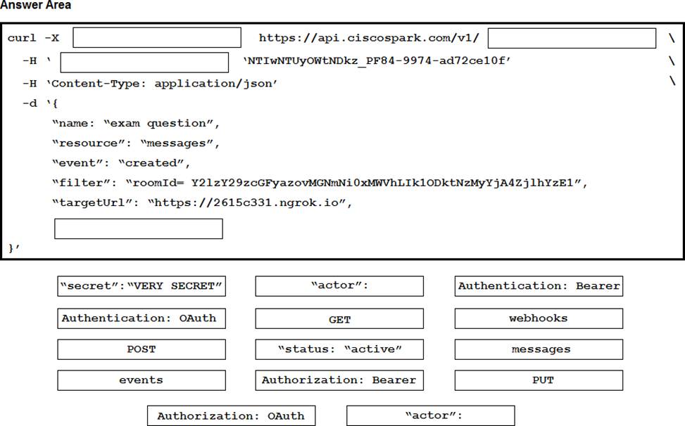 Drag and drop the code onto the snippet to complete the API request that was sent to Webex Teams so that the bot will receive these notifications. Not all options are used.