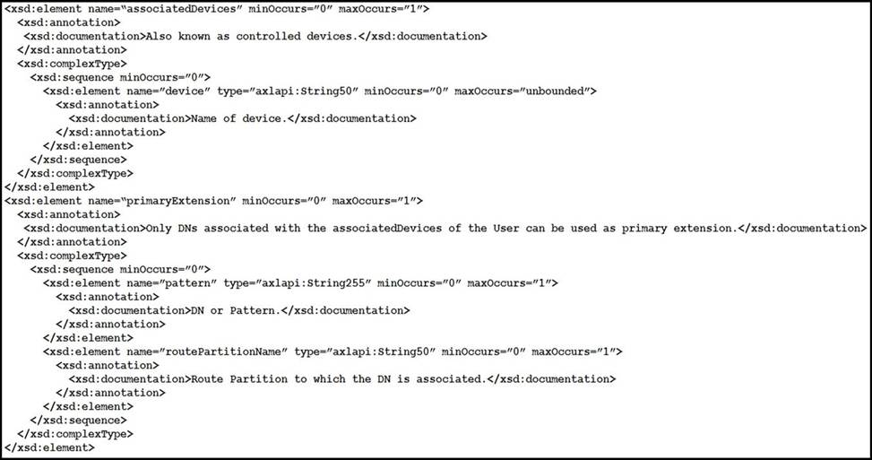 The exhibit shows the XML schema to associate a device for the AddUser operation in AXL.
