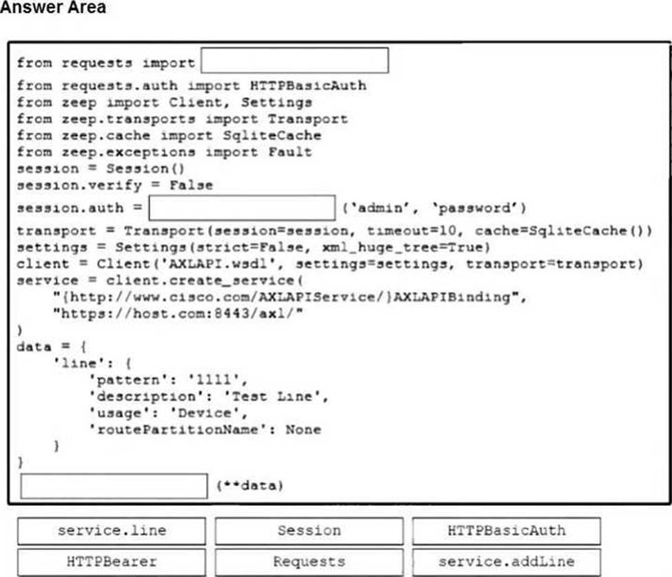 Drag and drop the code snippets from the bottom onto the blanks in the code to construct a Python script for Cisco UCM that provisions directory numbers. Not all options are used.