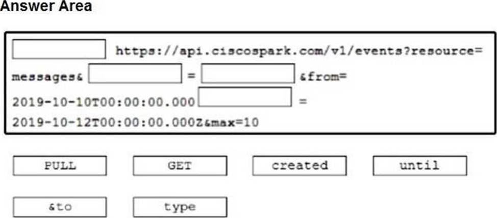 Drag and drop the code snippets from the bottom onto the blanks in the code to implement a call using the Cisco Webex REST API to retrieve 10 messages in an organization created between October 10th 2019 and October 12th 2019. Not all options are used.