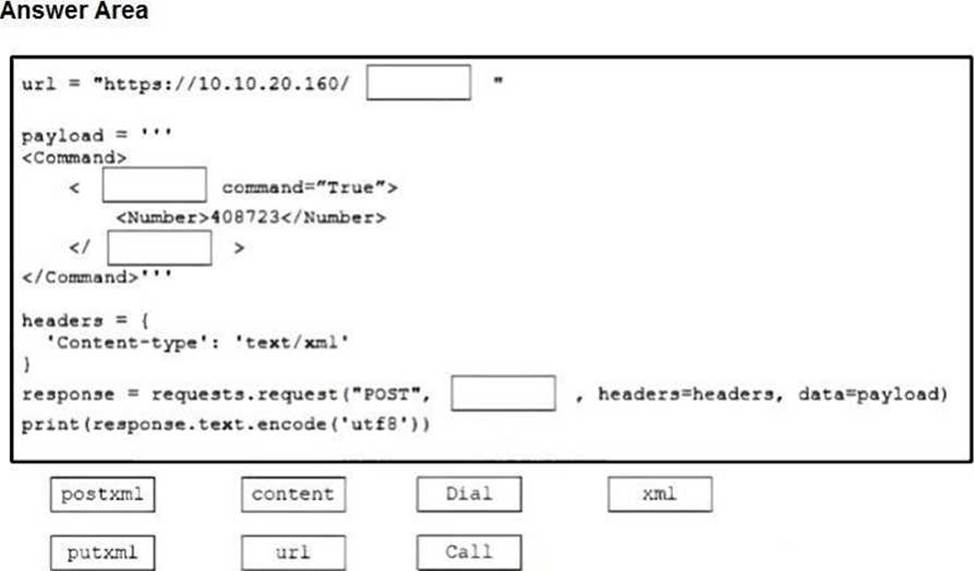An administrator must test a Cisco collaboration room device. Drag and drop the code snippets from the bottom onto the blanks in the code to perform a test call using the xAPI. Some options may be used more than once. Not all options are used.