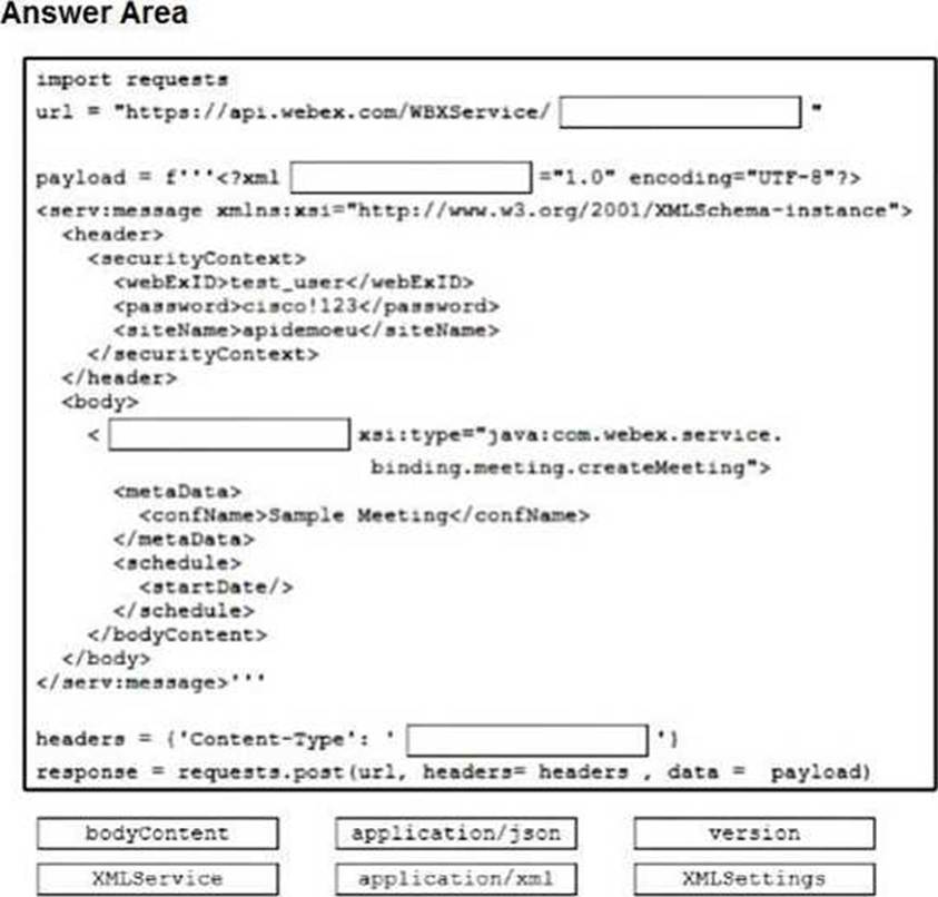 Drag and drop the code snippets from the bottom onto the blanks in the code to create a Cisco Webex CreateMeeting API request. Not all options are used.