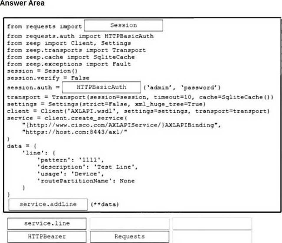 Drag and drop the code snippets from the bottom onto the blanks in the code to construct a Python script for Cisco UCM that provisions directory numbers. Not all options are used.