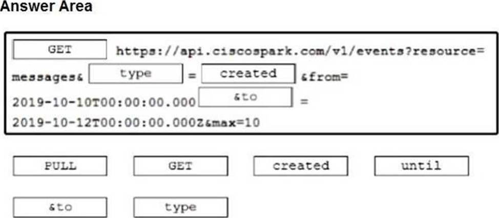 Drag and drop the code snippets from the bottom onto the blanks in the code to implement a call using the Cisco Webex REST API to retrieve 10 messages in an organization created between October 10th 2019 and October 12th 2019. Not all options are used.