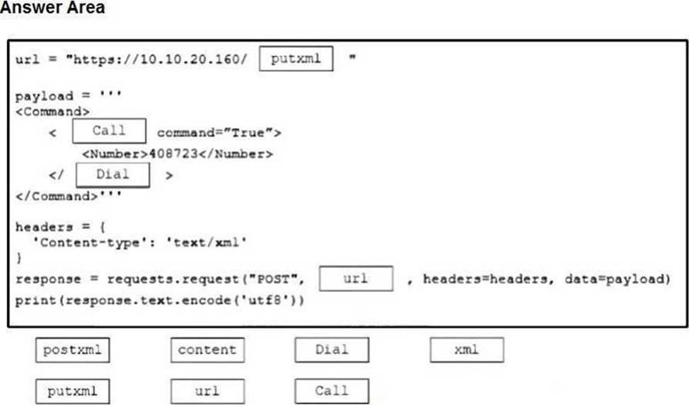 An administrator must test a Cisco collaboration room device. Drag and drop the code snippets from the bottom onto the blanks in the code to perform a test call using the xAPI. Some options may be used more than once. Not all options are used.