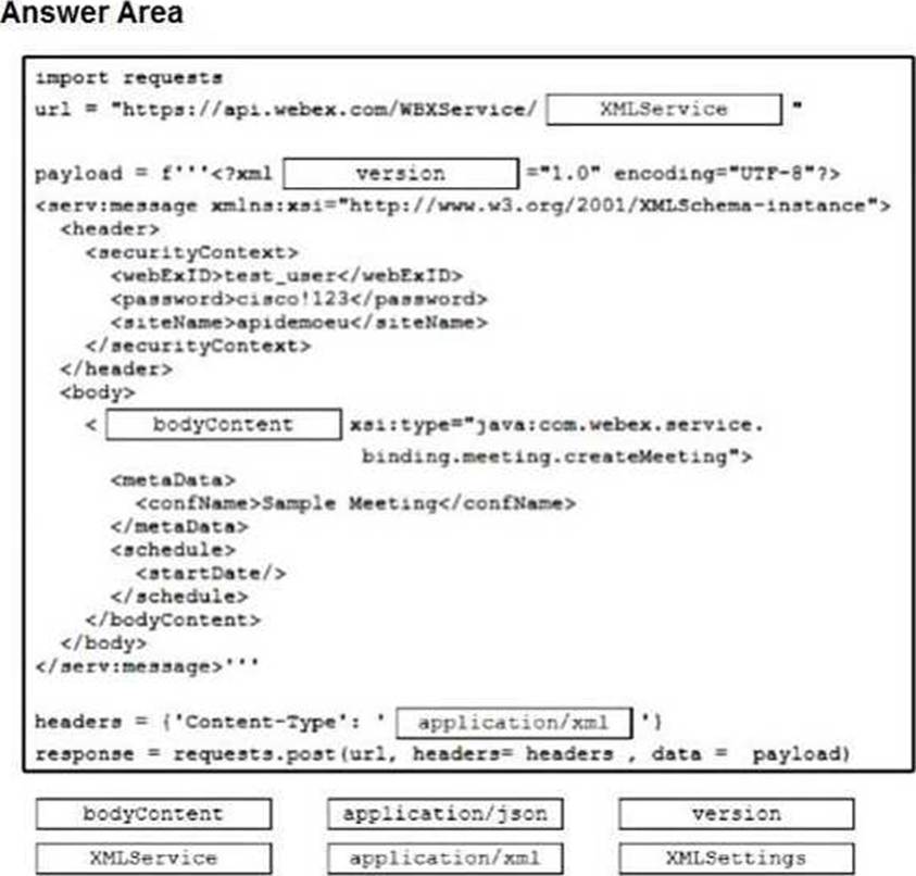 Drag and drop the code snippets from the bottom onto the blanks in the code to create a Cisco Webex CreateMeeting API request. Not all options are used.