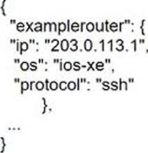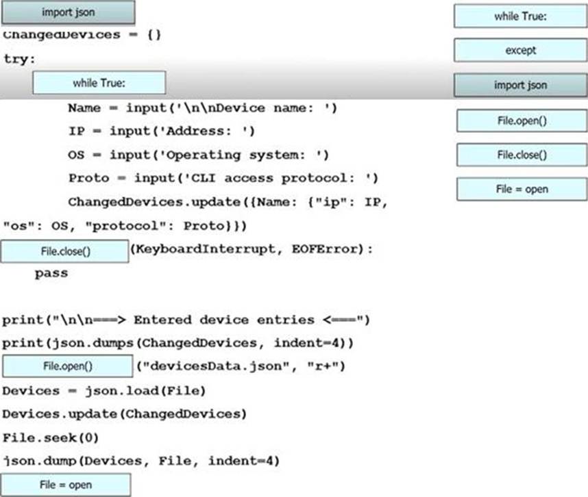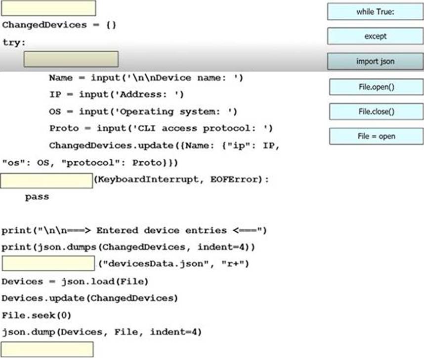 An engineer must create a script to append and modify device entries in a JSON-formatted file.