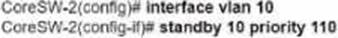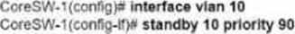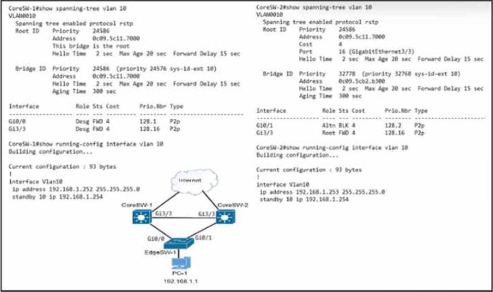 Which configuration causes the traffic from PC-1 to the internet to use the link between CoreSW-1 and CoreSW-2 when both switches are up?