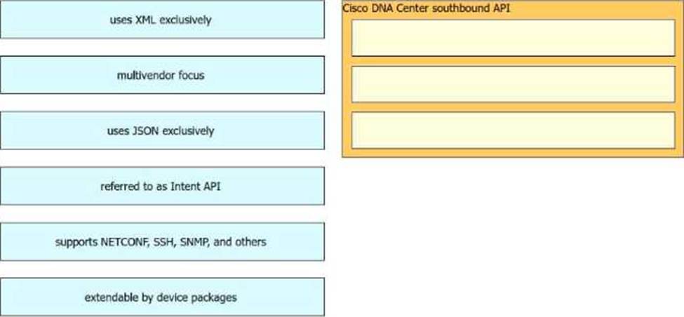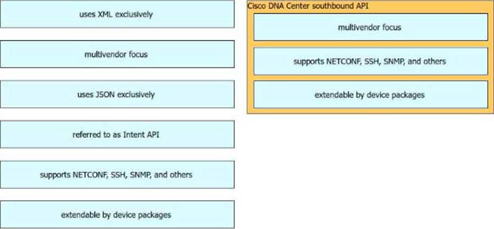 Drag and drop the Cisco Catalyst Center (formerly DNA Center) southbound API characteristics from the left to the right. Not all options are used.