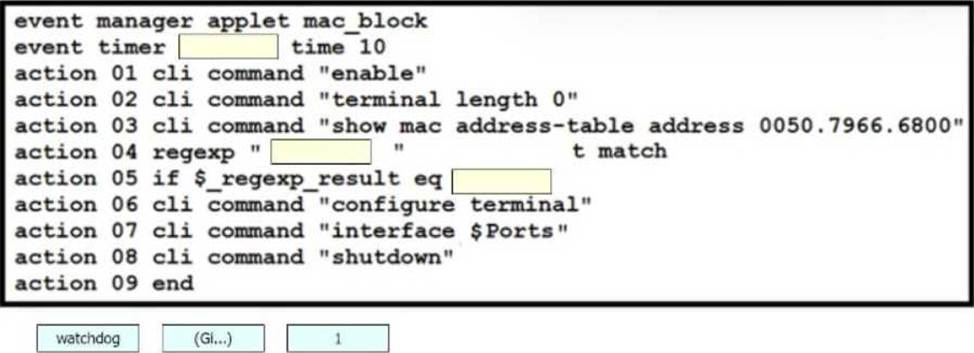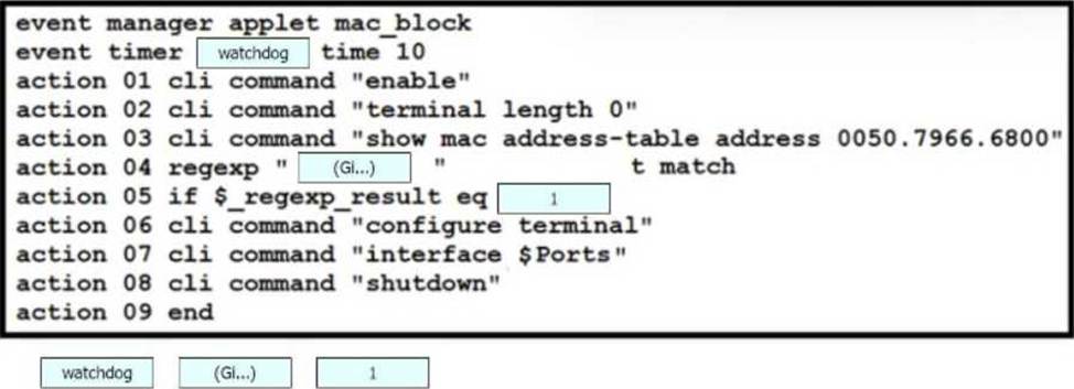 Drag and drop the snippets onto the blanks within the code to construct a script that blocks a MAC address.