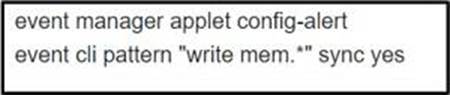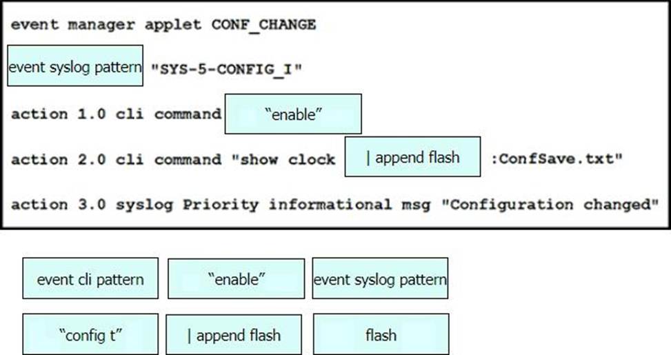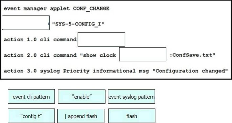 Drag and drop the snippets onto the blanks within the code to create an EEM script that adds an entry to a locally stored text file with a timestamp when a configuration change is made. Not all options are used.