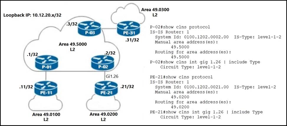 A network engineer notices PE-21 convergence degradation due to the growing LSDB size of Level 2 areas in the network. The engineer decides to migrate router PE-21 from an inter-area design to an intra-area implementation. Inter-area routing must be accomplished via an ATT-bit set by the Level 1/Level 2 router.