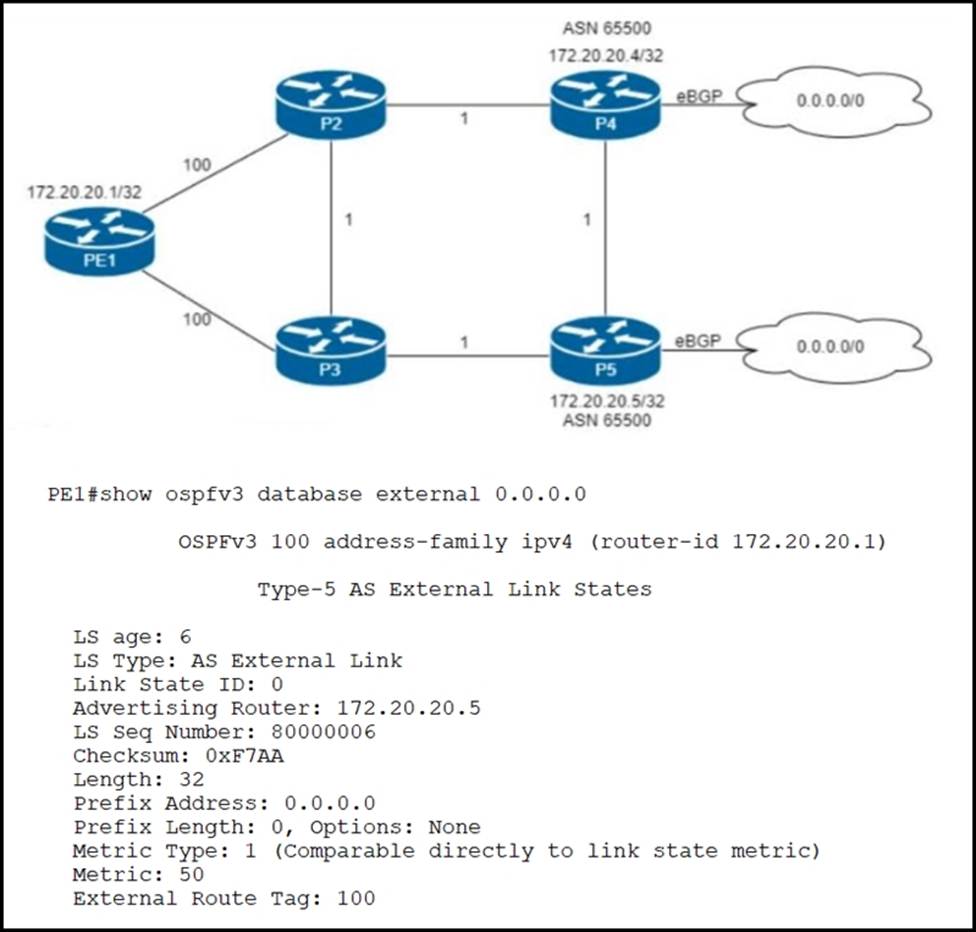 Router P4 and P5 receive the 0.0.0.0/0 route from the ISP via eBGP peering P4 is the primary Internet gateway router, and P5 is its Backup. P5 is already advertising a default route into OSPF domain.