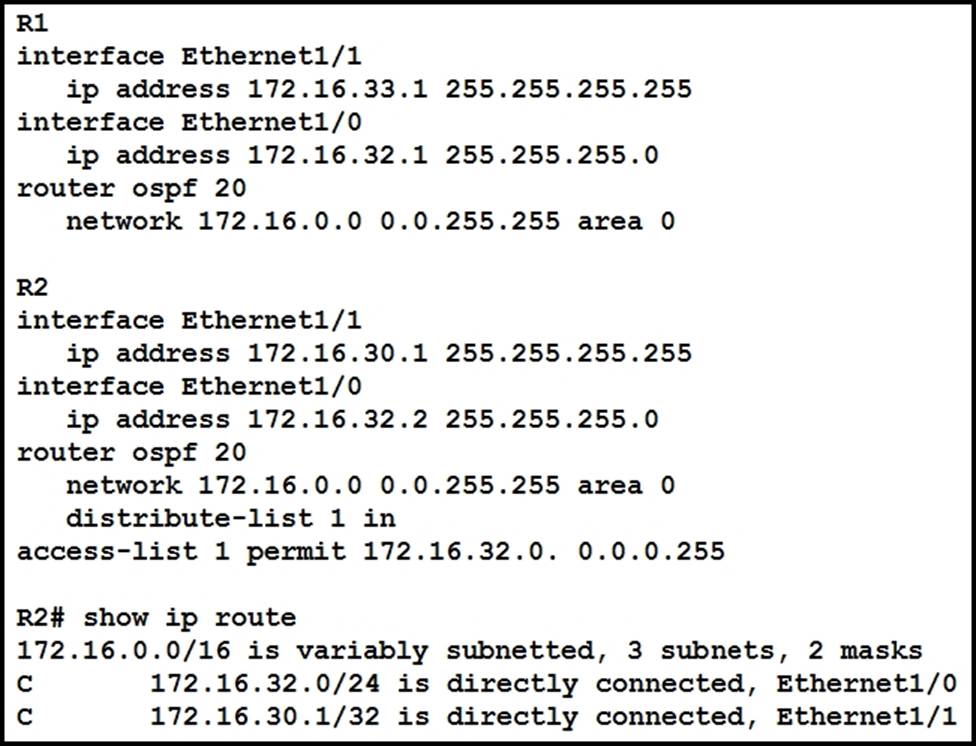 A network engineer notices that router R2 is failing to install network 172.16.33.1/32 in the routing table.