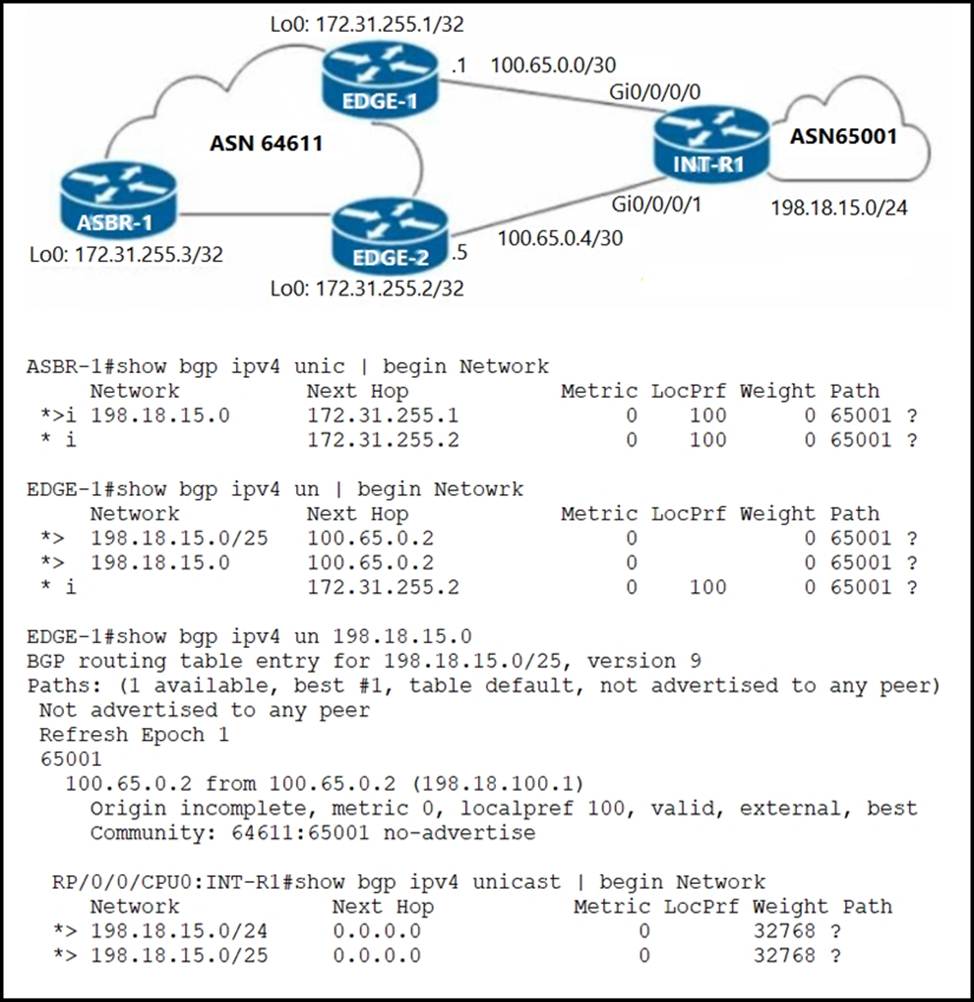 ✑ Routing to IP destinations in the 198.18.15.128/25 block must be preferred via the EDGE-2 PE.