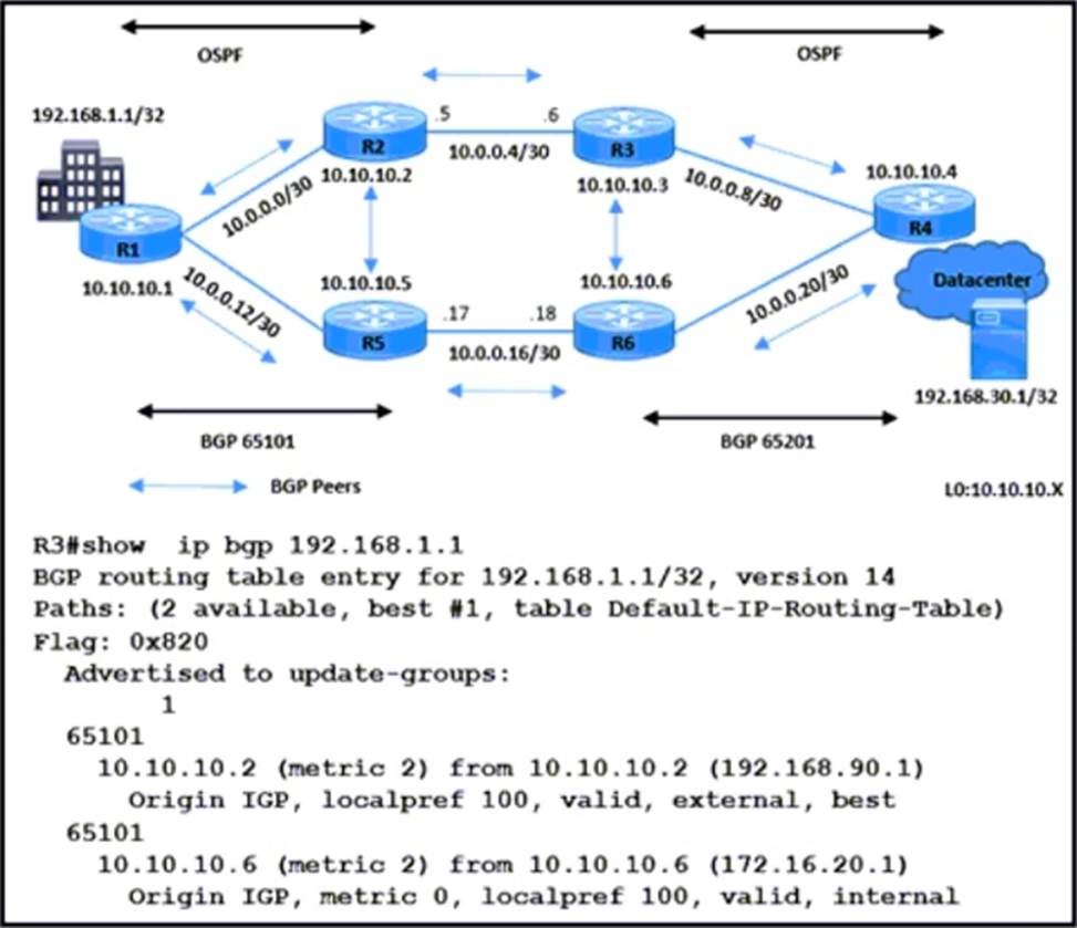 A network engineer is implementing BGP in AS 65101 and AS 65201. R3 sends data traffic to 192.168.1.1 /32 via the path R3-R2-R1. The traffic must travel via alternate path R6-R5 for prefix 192.168.1.1/32.