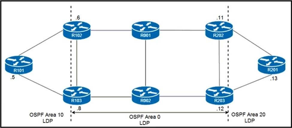 R101 is peering with R102 and R103, and R201 is peering with R202 and R203 using iBGP Labeled Unicast address families. The OSPF area 0 border routers are in a full iBGP Labeled Unicast mesh, and VPNv4 routes are exchanged directly between PE routers R101 and R201 through iBGP.