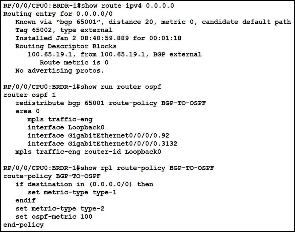 Router BRDR-1 is configured to receive the 0.0.0.0/0 and 172.17.1.0/24 network via BGP and advertise then into OSPF area 0. An engineer has noticed that the OSPF domain is receiving only the 172.17.1.0/24 route and default router 0.0.0.0/0 is still missing.