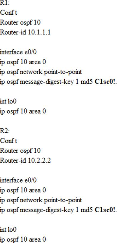 Enable OSPF MD5 Authentication between both routers at the interface level with password C1sc0!.