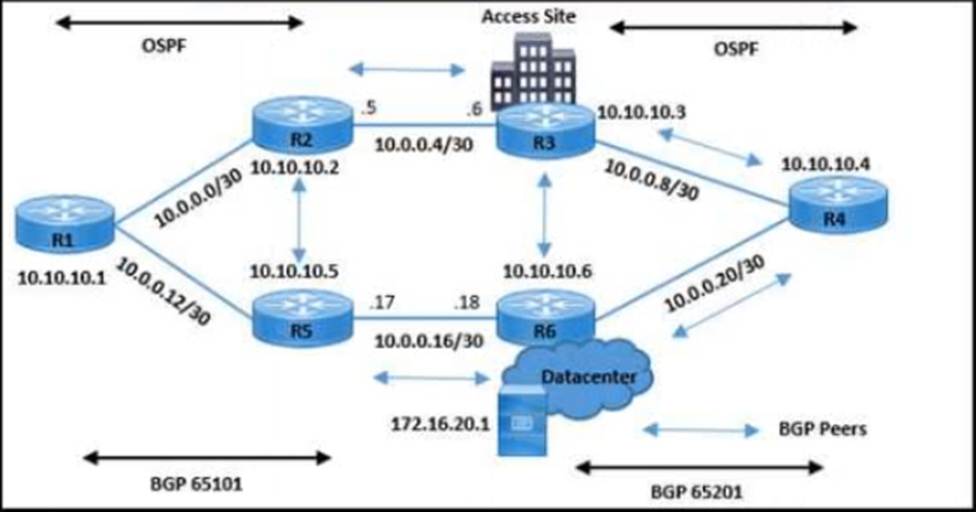 The network operations team reported that the access site that is connected to R3 is not connecting to the application server in the data center and that all packets that are sent from the application server to the access site are dropped. The team verified that OSPF and BGP peerings are up in BGP AS 65101 and BGP AS 65201. R4 is expected to receive traffic from the application server route via OSPF.