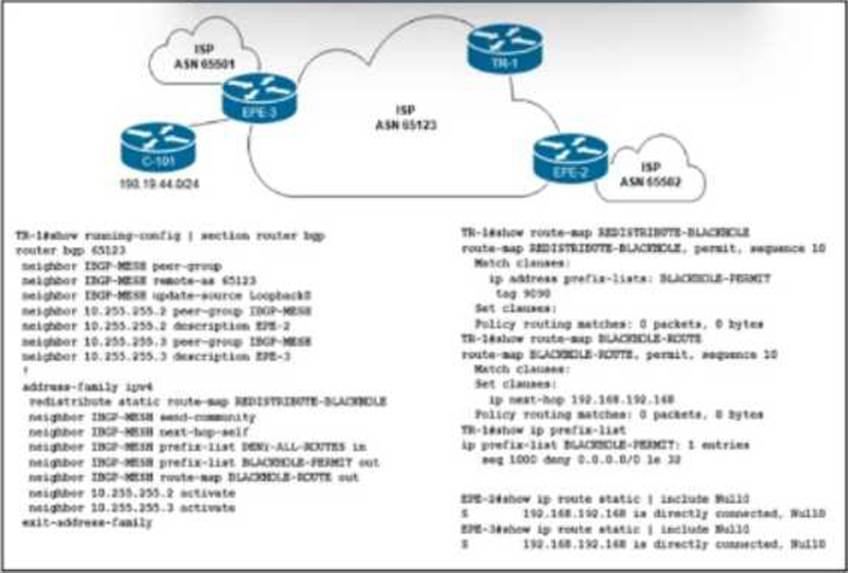 Customer C-101 in ASN 65123 requested that the ISP blackholes a host route 198.19.44.195, to which the customer is receiving a significant amount of malicious traffic.