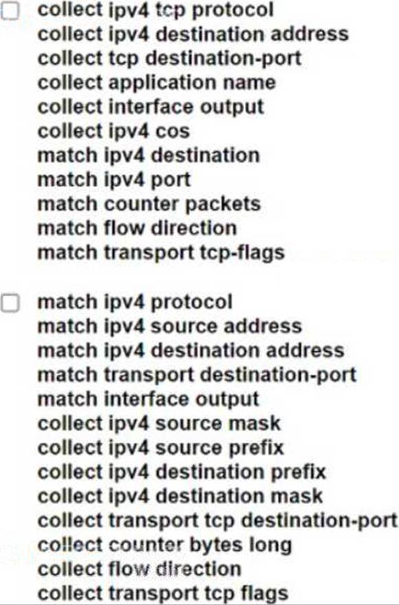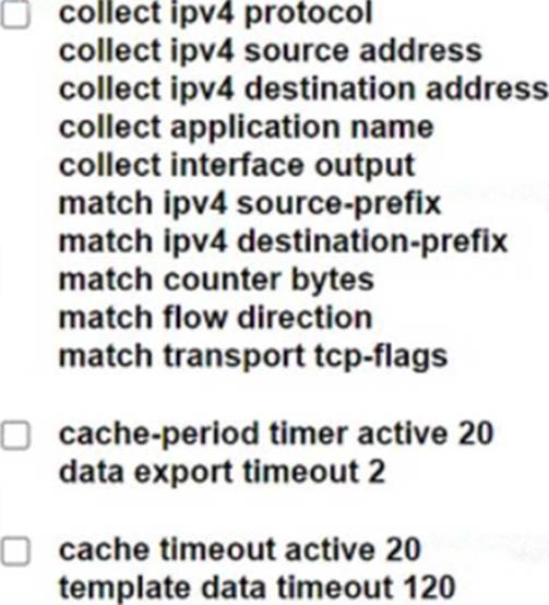 A network engineer must collect traffic statistics for an internal LAN toward the internet The sample must include the source and destination IP addresses, the destination ports, the total number of bytes from each flow using a 64-bit counter, and all transport flag information. Because of CPU limits, the flow collector processes samples that are a maximum of 20 seconds long.