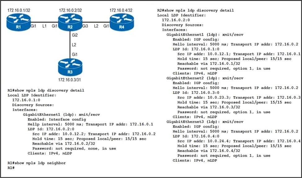 - A . Configure the mpls Idp neighbor 172.16.0.1 password command on R1