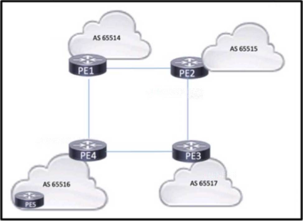 Four midsize service providers provide access to different customers that use Layer 3 VPN services to enable communication across geographic regions. The service providers are connected as shown in the exhibit, and the PEs have established eBGP relationships. PE4 has an IBGP relationship with PE5. The routes that PE4 learns from PE5 must reach the other PE routers, but they are absent from the routing tables on the other PES.