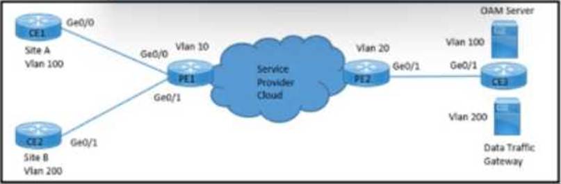 A network engineer with an employee ID: 5086:72:817 is configuring a connection to manage CE1 from the OAM server on VLAN 100. PE1 must push S-VLAN tag 10 toward PE2 while forwarding traffic from CE1 to the OAM server. PE1 must push S-VLAN tag 20 toward PE2 while forwarding traffic from CE2 to the data traffic gateway.