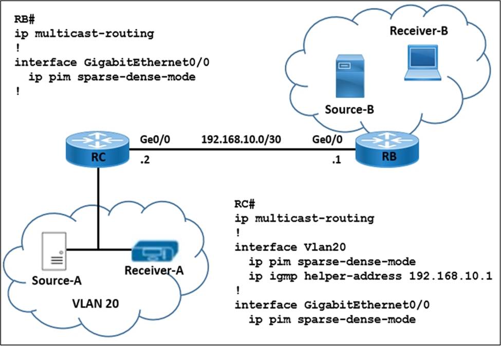 A network engineer is implementing multicast Source-A to send a multicast stream for Receiver-A, and multicast Source-B to send a multicast stream for Receiver-B. Router RC forwards the IGMP host a report and leaves messages to IP address 192.168.10.1.