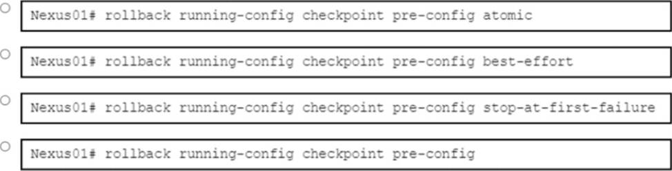 A network engineer must roll back a configuration change made on a Cisco Nexus 9300 Series Switch. Before the change, the network engineer created a checkpoint named pre-config. The rollback abort if any errors occur.