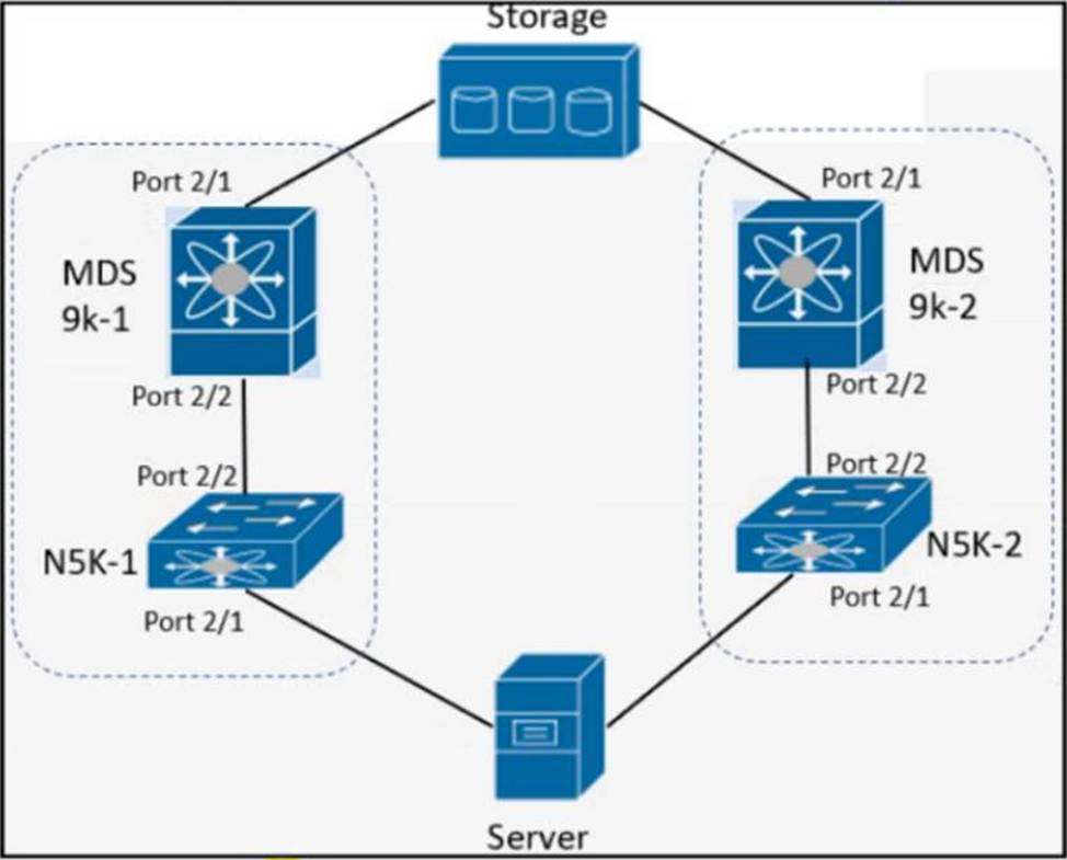 The server is sending traffic to the storage server using Fiber Channel protocol. The requirement is for the N5K-1 to forward traffic to MDS9k-1.