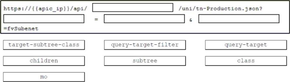 Drag and drop the keywords onto the URL request to collect all the subnets configured under tenant Production using a REST API. Not all options are used.
