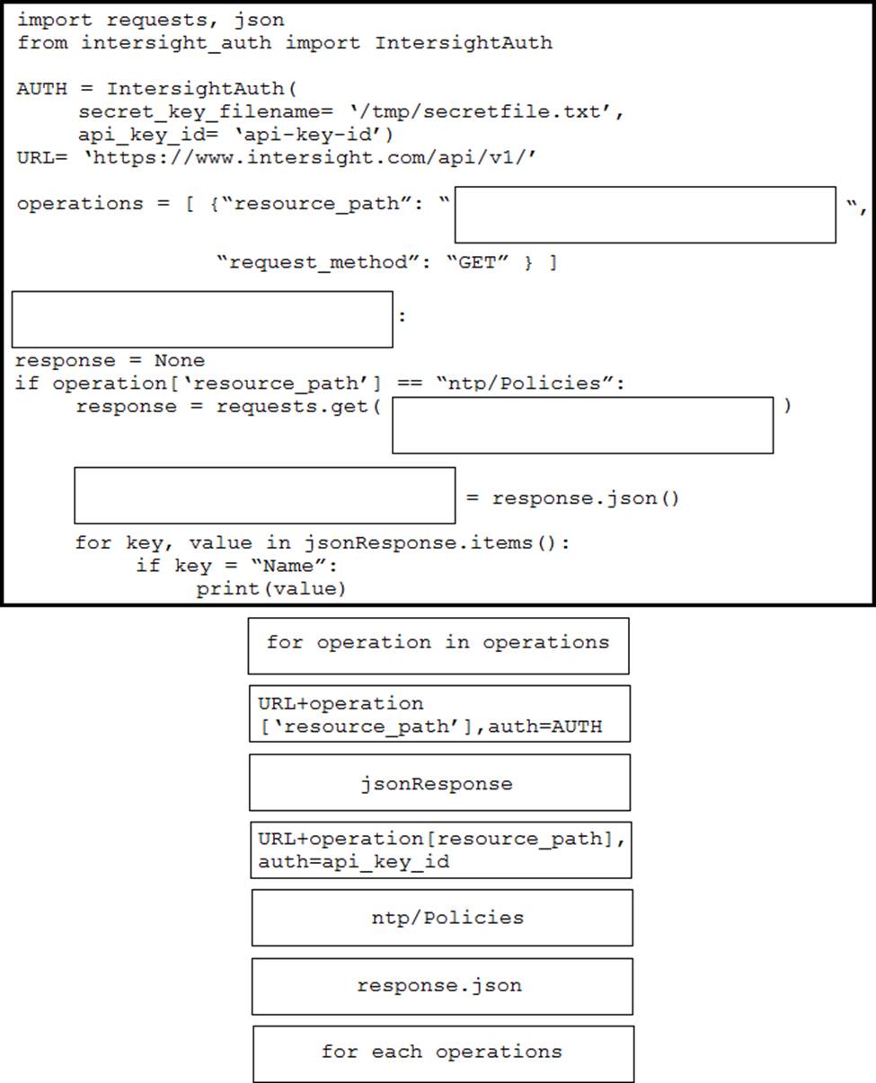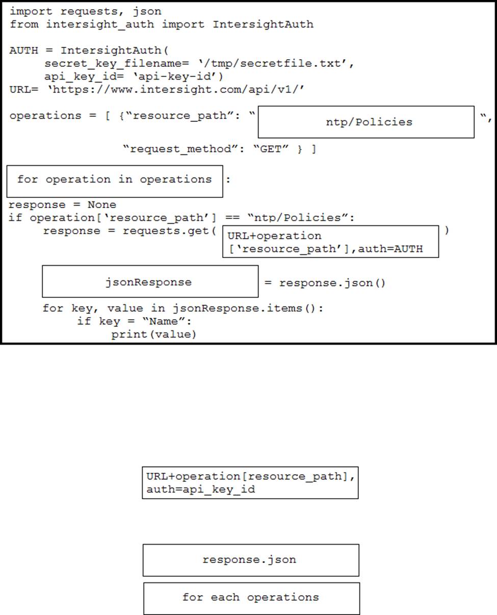 Drag and drop the code from the bottom onto the box where the code is missing in the Python script to execute a REST API call to query all the NTP policy names and print the name of each policy. Not all options are used.