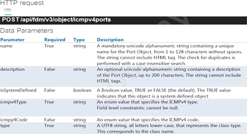 - C . "description": "string", "icmpv4Code": "ANY_IPV4", "icmpv4Type": "ANY", "id": "string", "is System Defined": "string", "name": "string", "type": "icmpv4portobject", "version": "string"