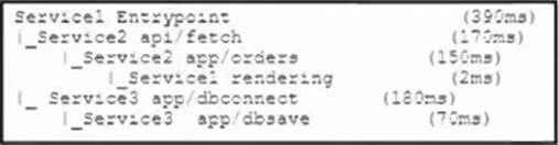 A microservices application is monitored by using distributed tracing. The tracing application output represents the parent-child relationships and the total time that it took to execute each task.