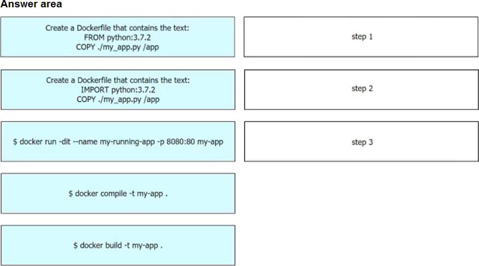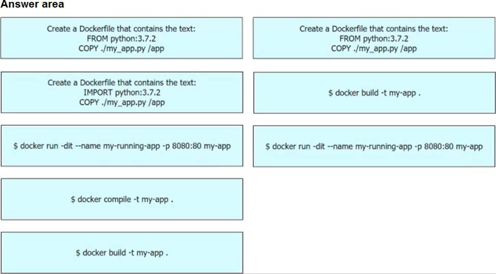 Drag and drop the steps from the left into the order on the right to build and run a customized Python Docker image. Not all options are used.