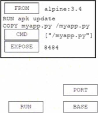 Drag and drop the code from the bottom onto the box where the code is missing on the Dockerfile to containerize an application that listens on the specified TCP network port at runtime. Not all options are used.