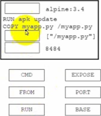 Drag and drop the code from the bottom onto the box where the code is missing on the Dockerfile to containerize an application that listens on the specified TCP network port at runtime. Not all options are used.