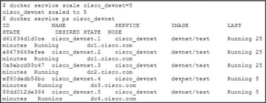 A developer runs the docker service scale command to increase the number of replicas for the cisco_devnet service. The swarm cluster is using a private IP address subnet.