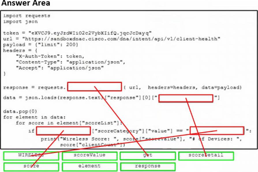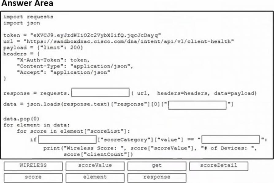 Drag and drop the code snippets from the bottom onto the blanks in the script to print only wireless device health information. Not all options are used.