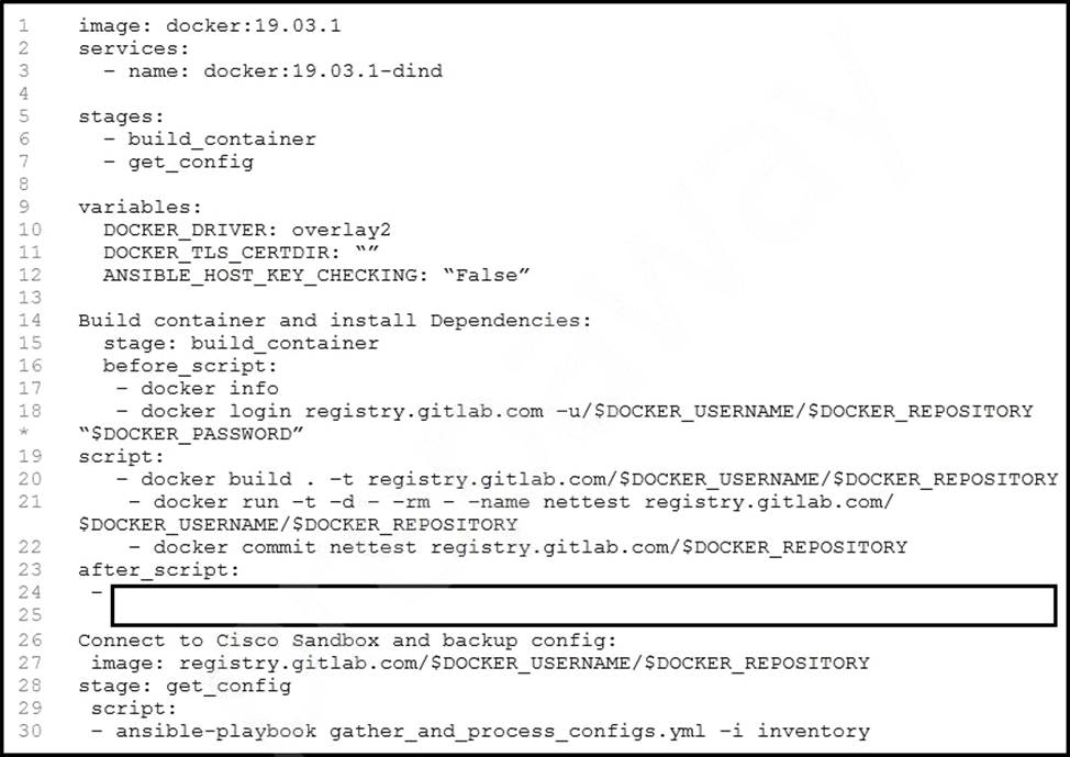 A developer wants to automatically deploy infrastructure for a containerized application. A .gitlab-ci.yml file must describe a pipeline that builds a container based on a supplied Dockerfile and executes an Ansible playbook on the configured container.