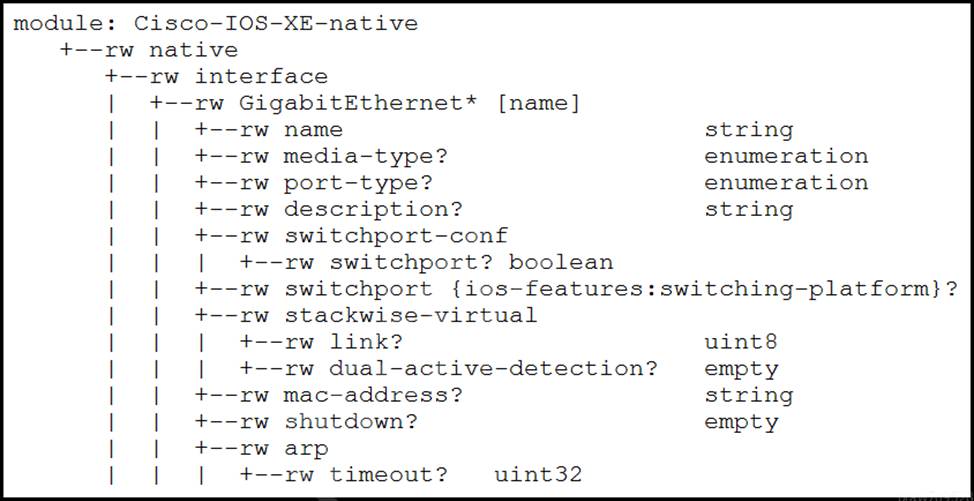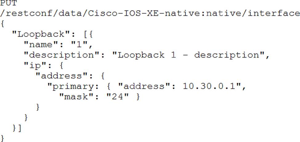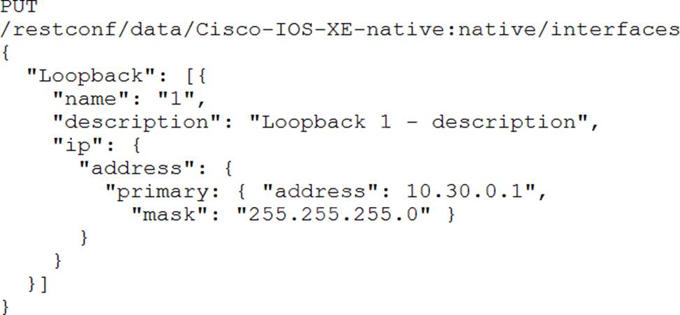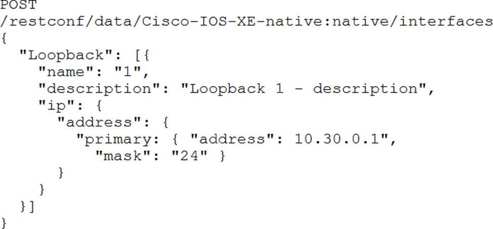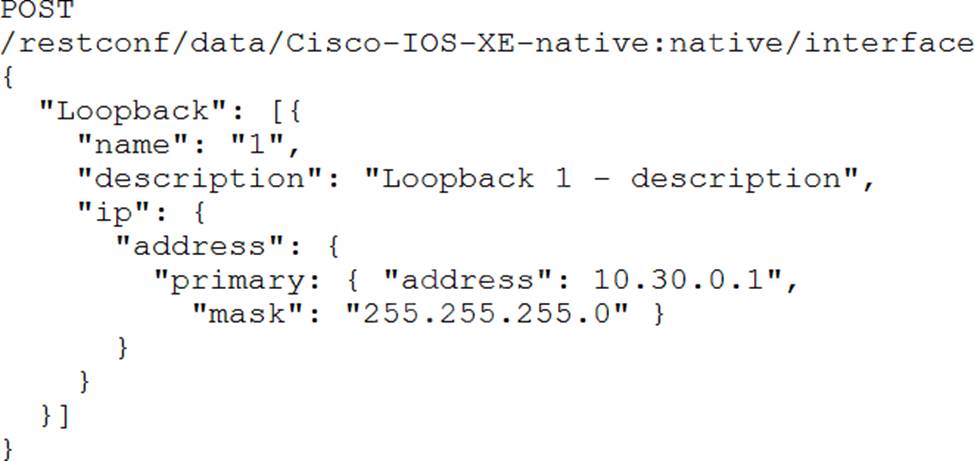 Interface Loopback 1 must be created with IP address 10.30.0.1/ 24 in a Cisco IOS XE device using RESTCONF. The schema that is defined by the exhibit must be used.