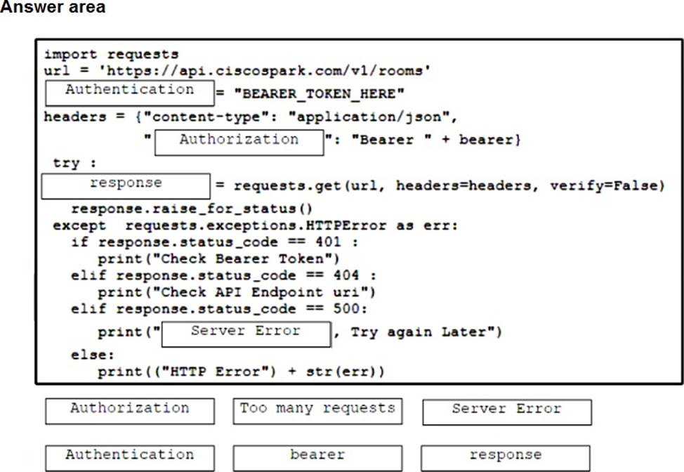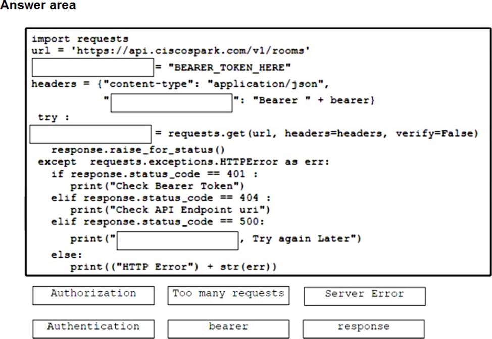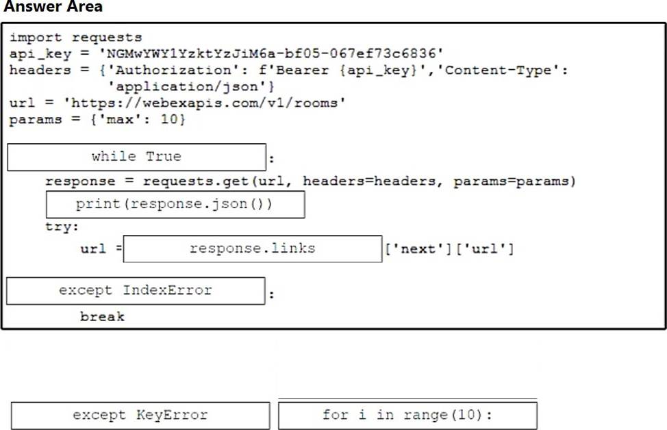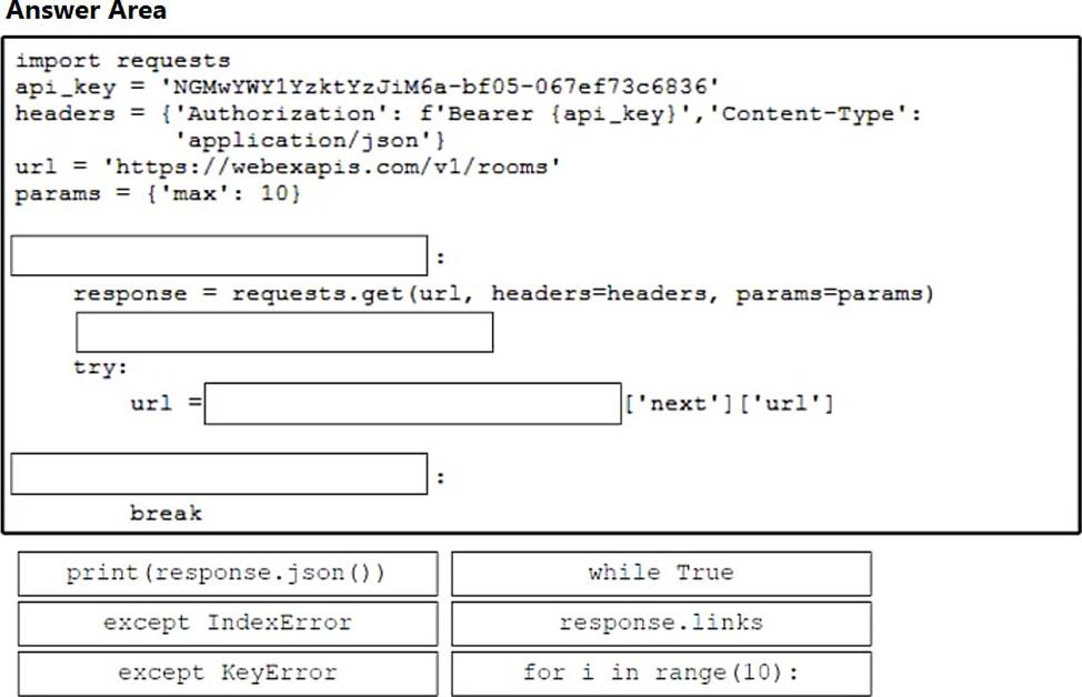Drag and drop the code snippets from the bottom onto the blanks in the Python script to retrieve a list of all the Cisco Webex rooms using pagination and the Webex API. Not all options are used.