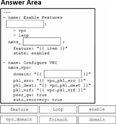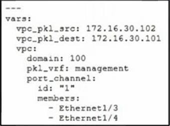Drag and drop the code snippets from the bottom onto the blanks in the code to complete the playbook for creation of an Ansible role that configures VPC on a Cisco Nexus switch. Not all options are used.