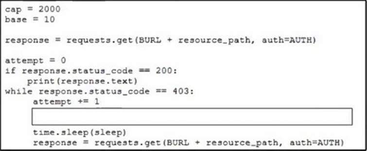 Which code snippet must be placed onto the blank in the code to add exponential backoff with jitter?