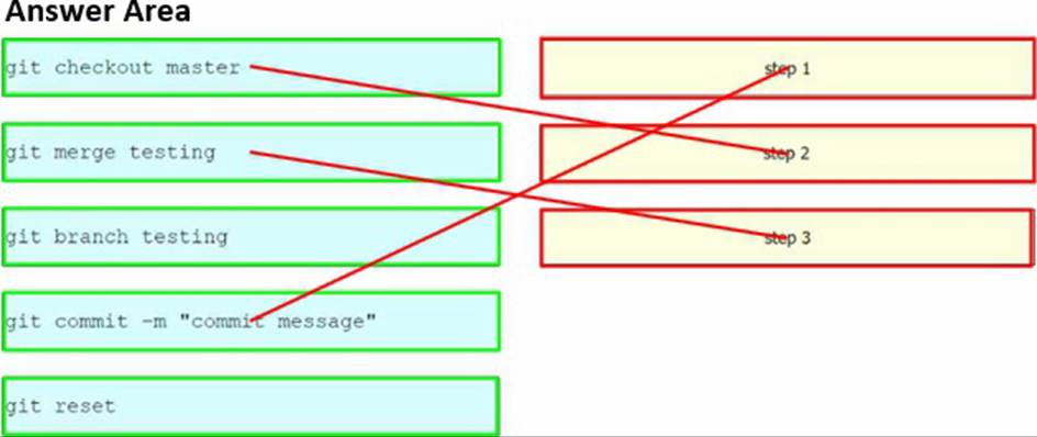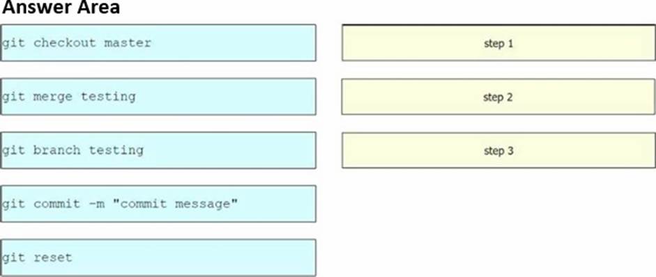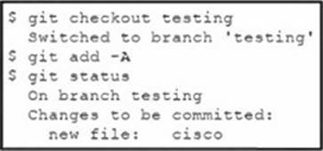 Drag and drop the Git commands from the left into the order on the right to merge the testing branch, with the new cisco file, into the master branch. Not all options are used.