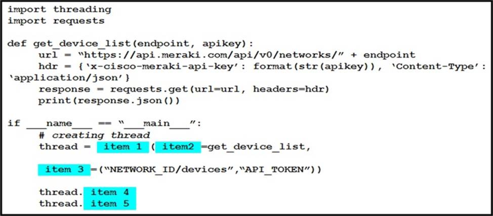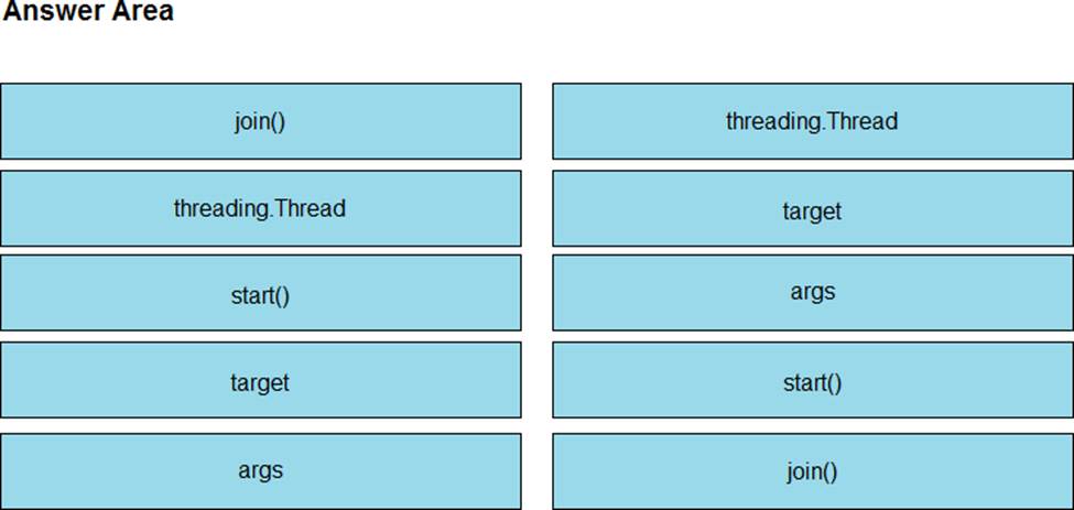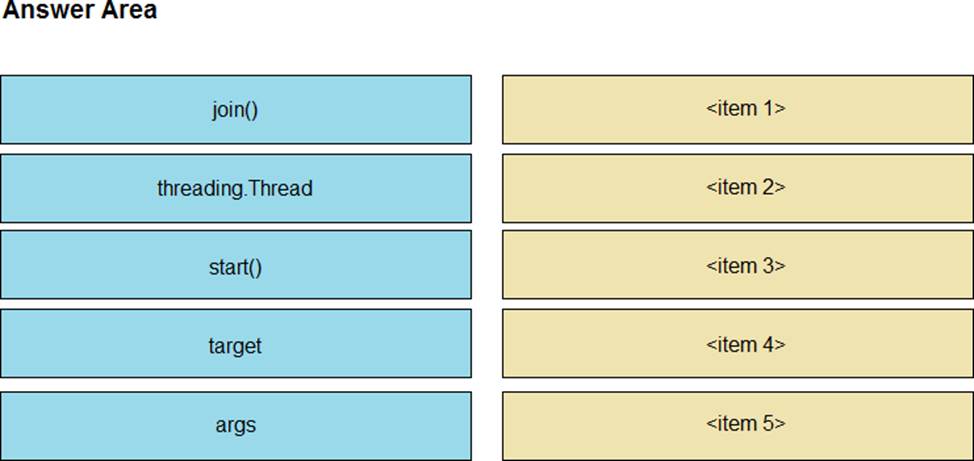 Drag and drop the code snippets from the left onto the item numbers on the right that match the missing sections in the exhibit to create a thread instance.